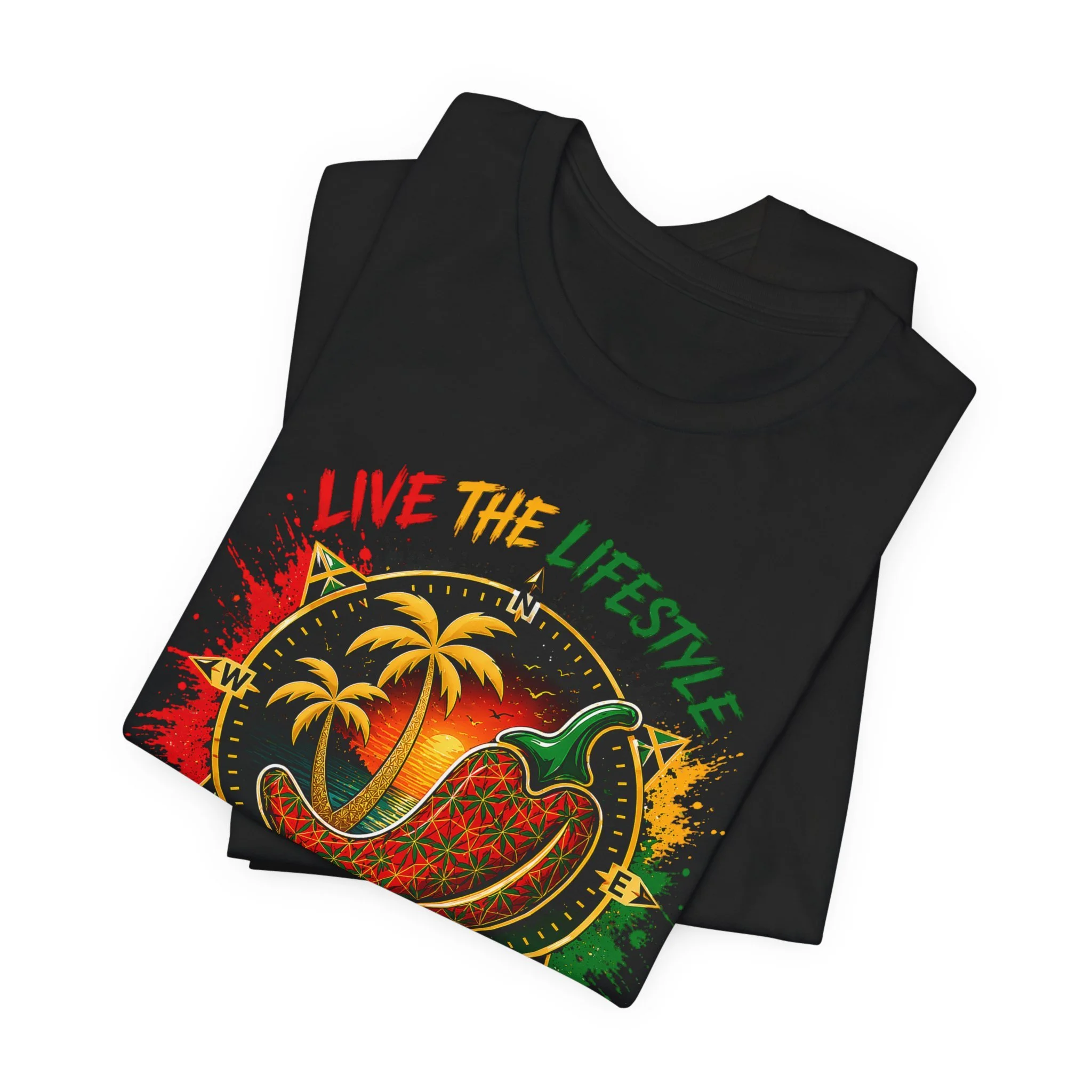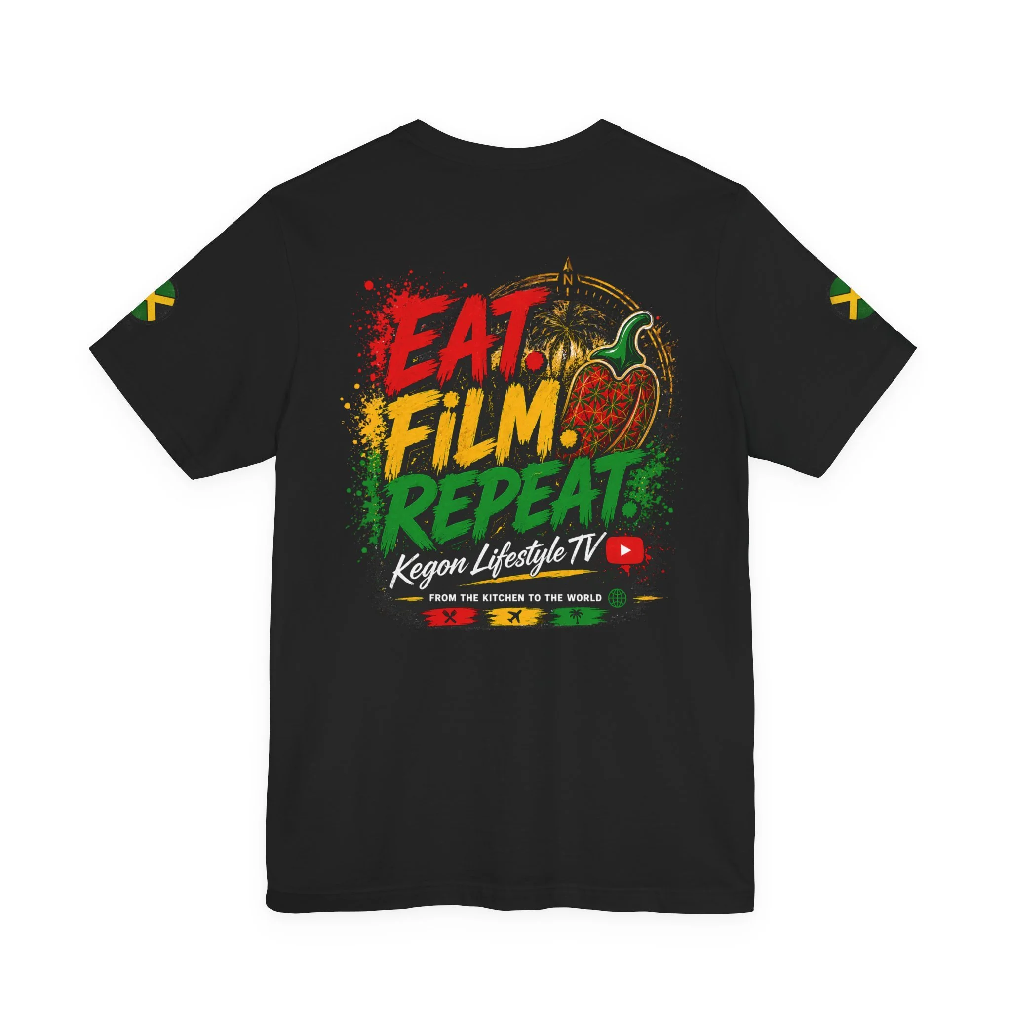 A lightweight, breathable tee that brings bold island energy to everyday wear. This cotton jersey shirt features vibrant front and back prints in red, yellow and green tones—palm trees and a fiery pepper on the chest, and a dynamic “EAT. FILM. REPEAT.” message across the back. The crew neck and retail fit keep the silhouette neat and easy to layer. Comfort details like side seams, ribbed knit collar, shoulder tape and a tear-away label make it wearable all day. Ethically produced and REACH certified, it blends spirited, travel-driven graphics with reliable everyday construction.